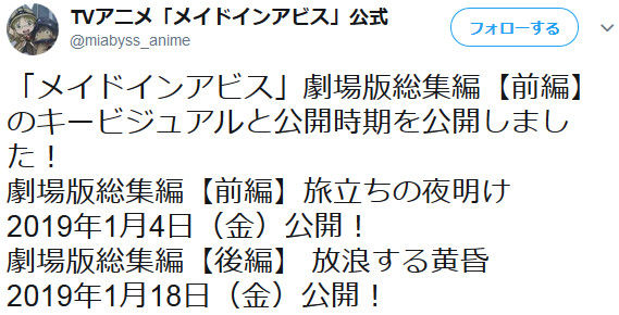 — TVアニメ「メイドインアビス」公式 (@miabyss_anime) 2018年7月26日