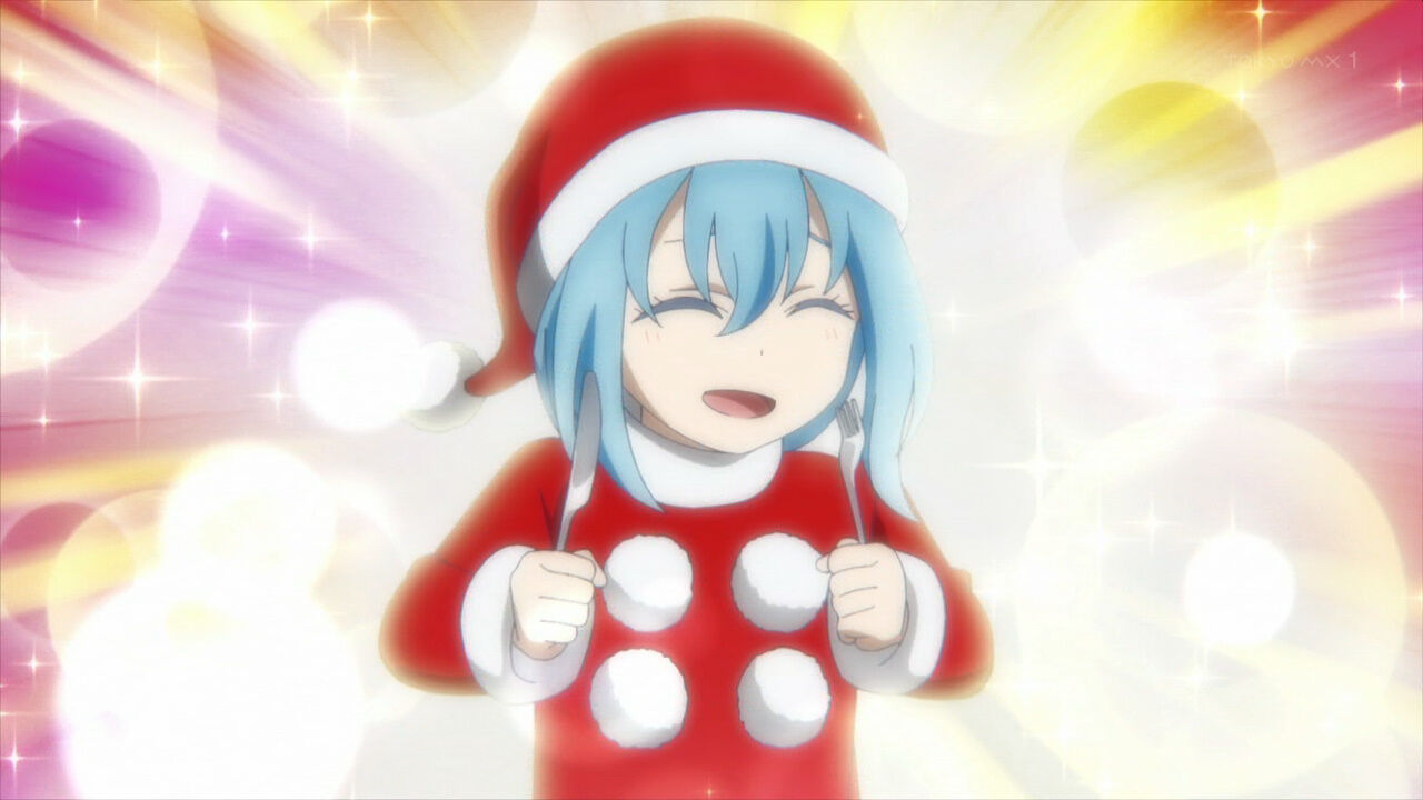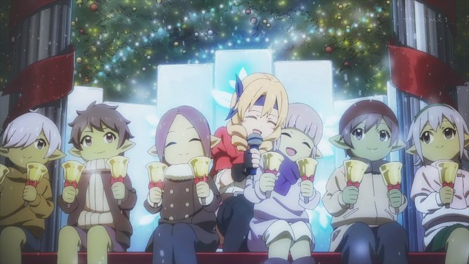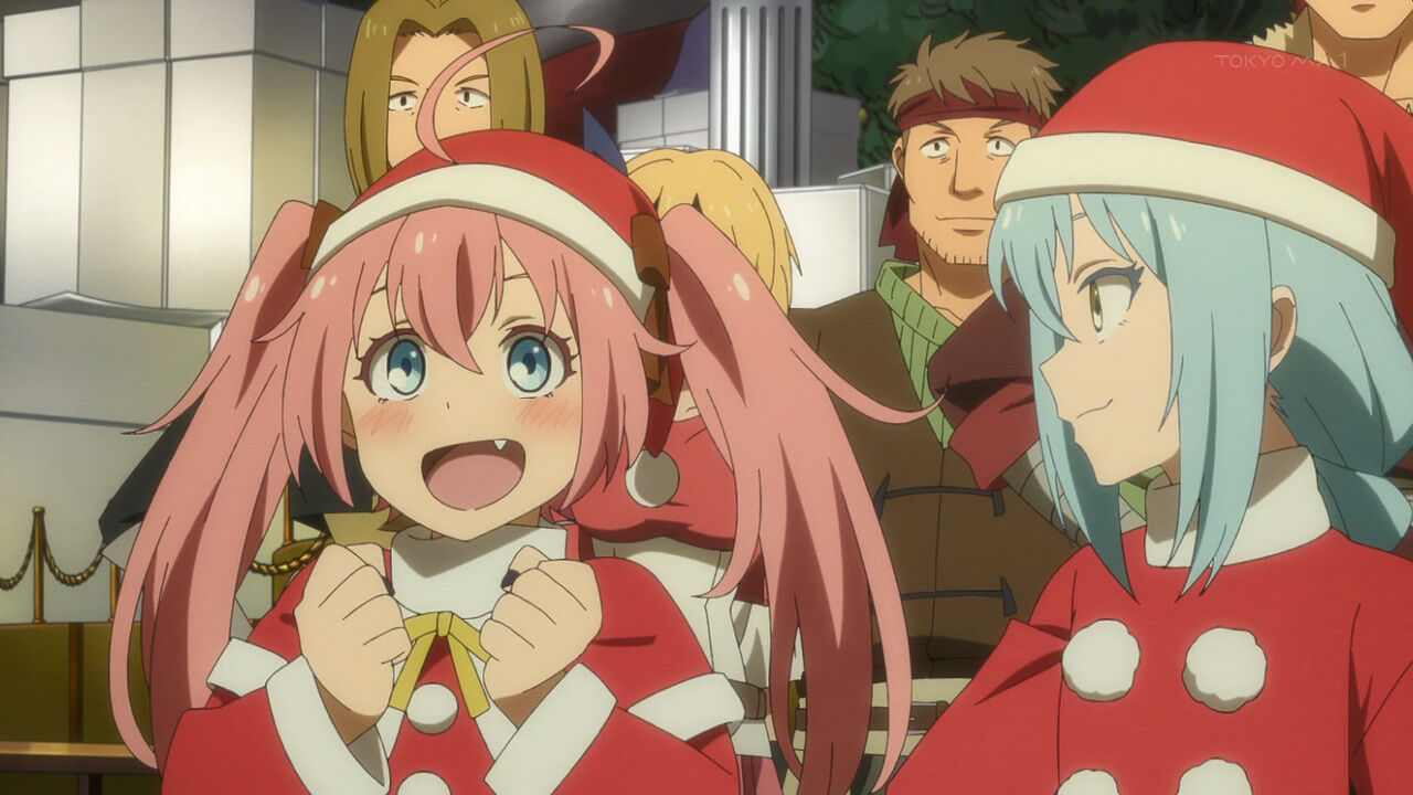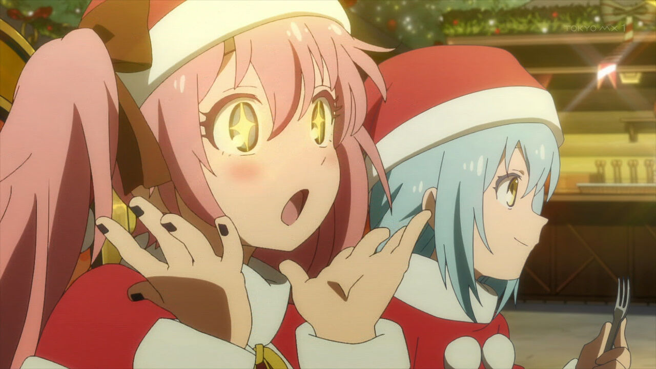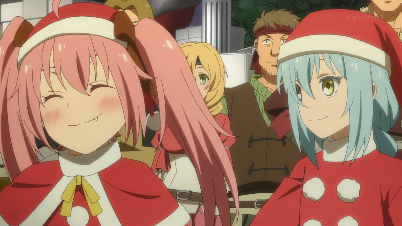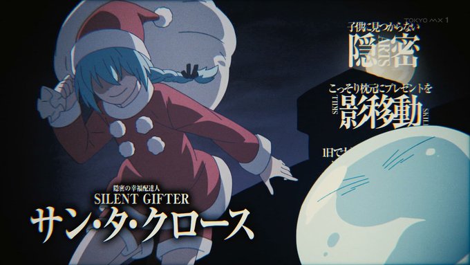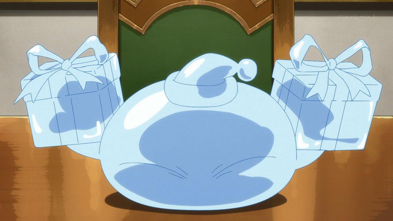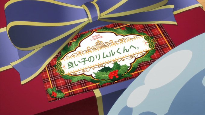 「#転スラ日記」11話、クリスマスとは、サンタクロースとは何か。リムルの説明はつまり祭だ宴だという線で理解される。街にはサンタ姿の男女があふれ、コドモ達が讃美歌風の歌を歌う。シュナ作のクリスマスケーキ、プレゼント交換、魔王ミリムもプレゼントを受け取る #転スラ #tensura #TensuraNikki
