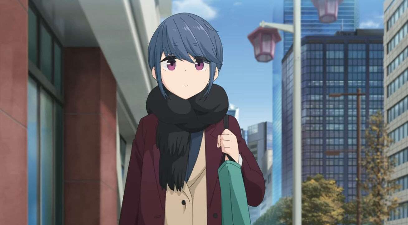 スーツで街を歩く志摩リンと、アウトドア用品店で働くなでしこが