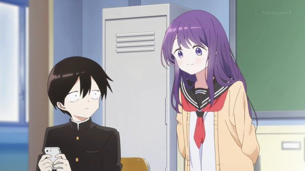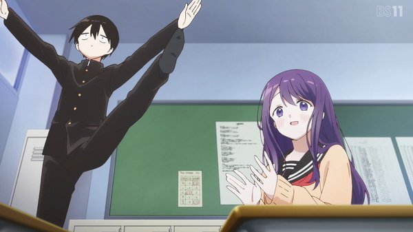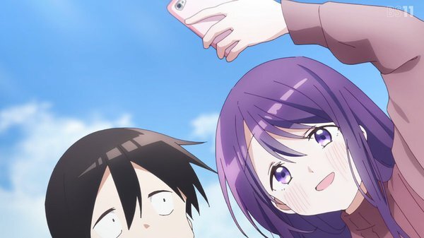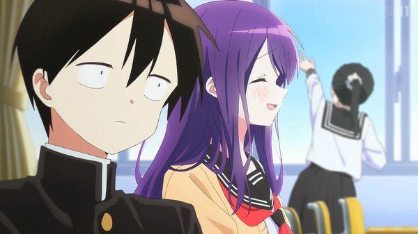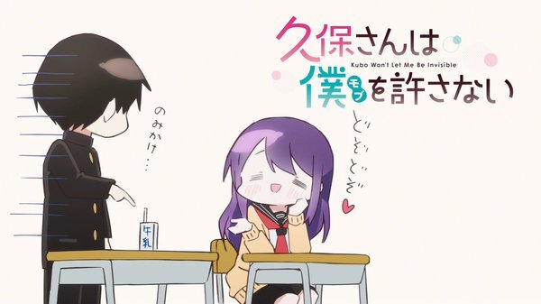「#久保さんは僕を許さない」1話、存在感が薄く気づかれにくい白石純太。なぜか隣席の久保渚咲だけは容易く白石を見つける。それはいいが面白がって白石を授業中立たせたり、皆がいる中で膝に乗る。カメラが認識しない白石にくっつきツーショット写真を撮ったりする #久保さん #kubosan #kubosan_anime